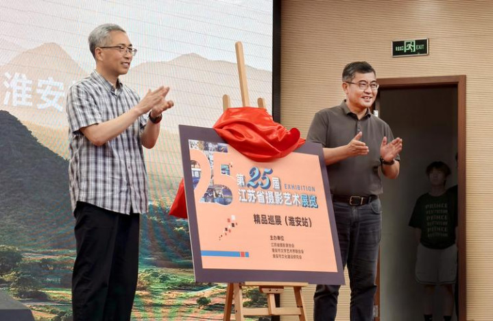 江苏省摄影家协会主席肖勇(右)、淮安市文联主席王维国(左),为第25届江苏省摄影艺术展览精品巡展(淮安站)揭幕(手机照片)。曹政/摄